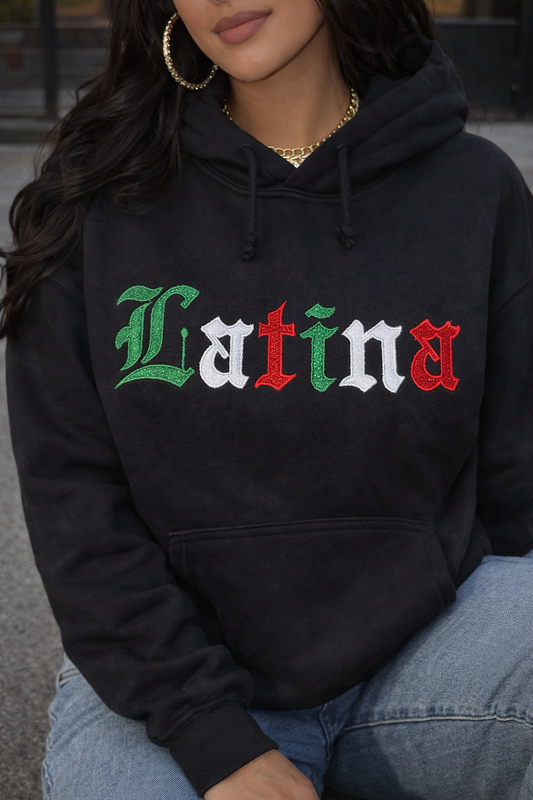 Custom Glitter “Latina” Embroidered Hoodie – Personalized Heritage Flag Colors | Mexican, Costa Rican, Salvadoran & More