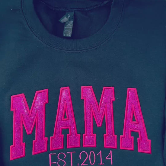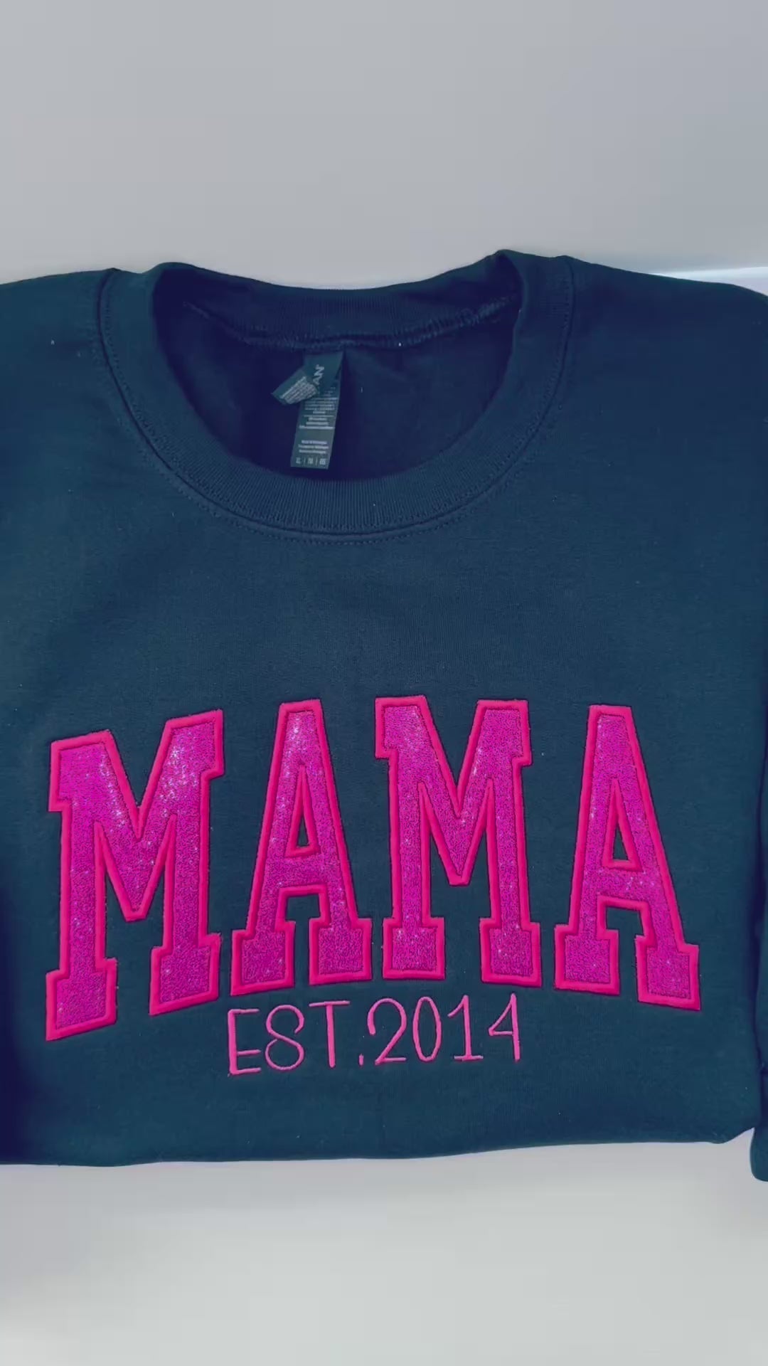 Give Mama something she’ll actually love wearing — bold, sparkly, and personalized just for her. This custom sweatshirt features glitter appliqué varsity letters, a stitched EST. year, and children’s names embroidered on the sleeve in your choice of thread colors.