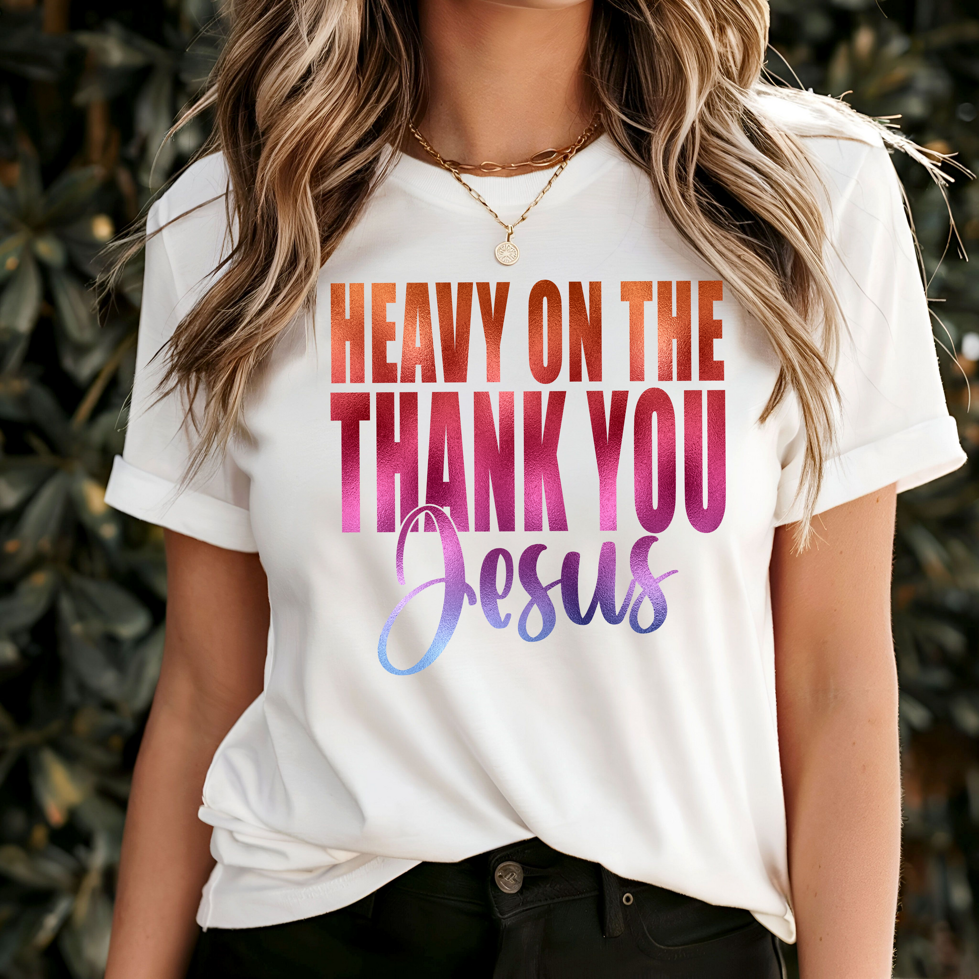 Unleash your bold style and spread positivity with our, "Heavy on the Thank You, Jesus" t-shirt. With its captivating message and bold colors, you'll turn heads and inspire others to give thanks. Share your passion for faith and fashion with this standout piece!