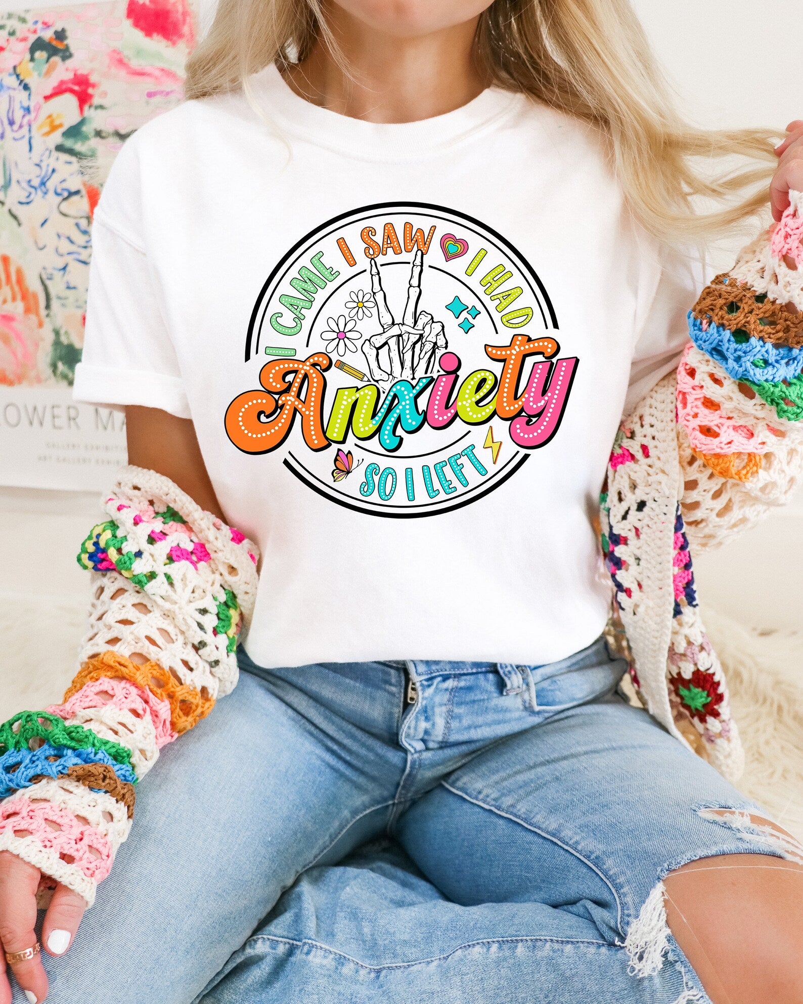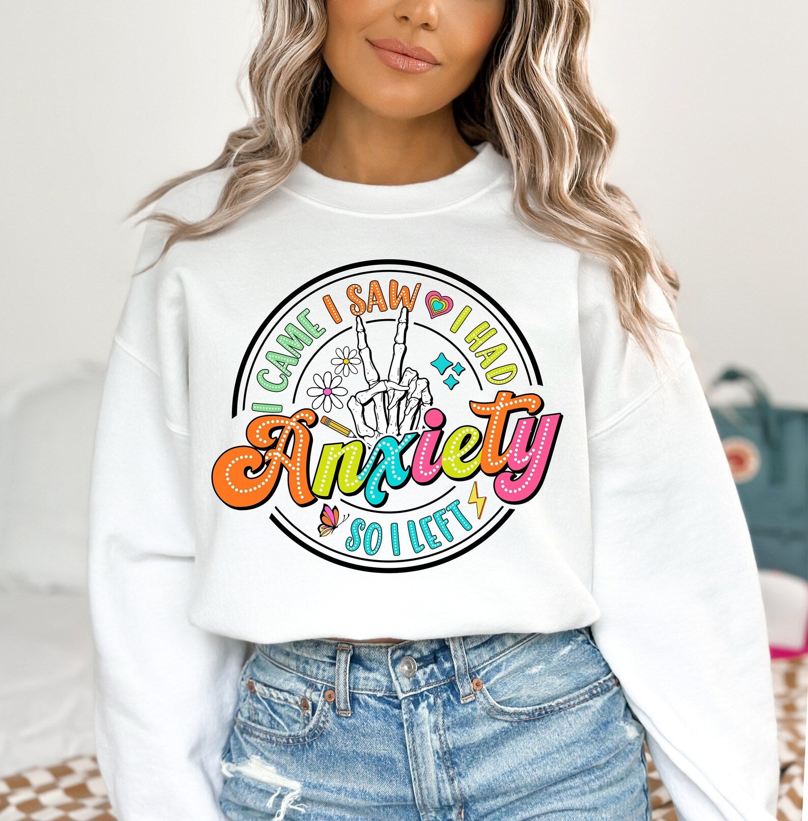 Make a bold (and hilarious) statement with our "I Came, I Had Anxiety, So I Left" Colorful Women’s T-Shirt or Sweatshirt! Designed for women who embrace their quirks and own their truths, this fun and vibrant piece is a perfect mix of humor and style. With a pop of colorful graphics, it’s sure to turn heads and spark smiles wherever you go.